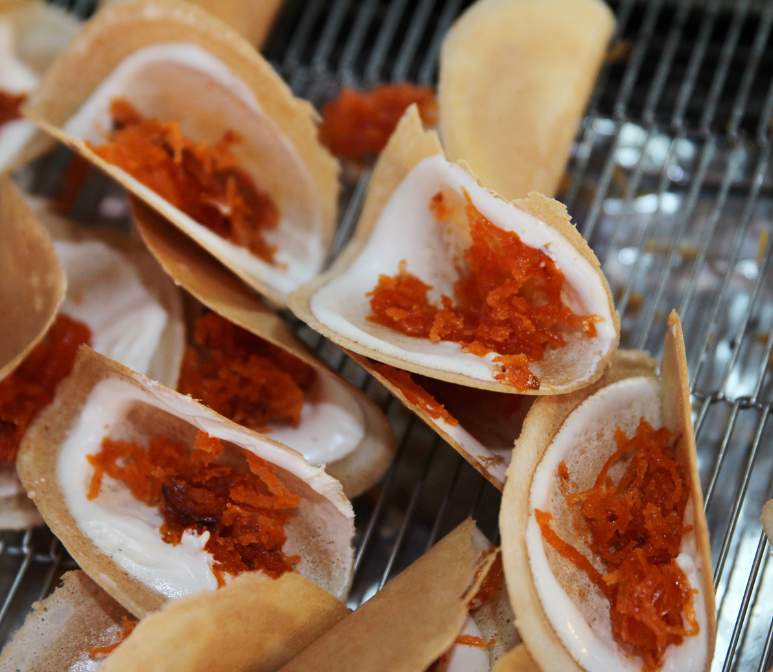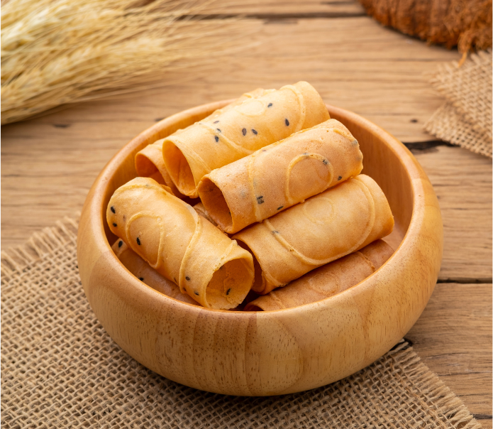 - ขนมทองม้วน ขึ้นรูปง่าย ลวดลายชัดเจน แผ่นบางเสมอกัน เวลากัดไม่ร่วง